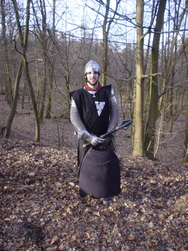 Gregory's kit: spaulders from Ld.William Avery, butted haubergeon from local maker, helmet from Czech smith, Lamellar plates (under taberd) from Pheylin Quinn / Massa G. Greaves from local armourer.