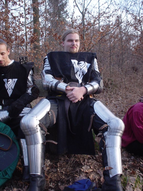 Damian kit: Arms and legs and spaulders from Armourer Eric (James River Armoury), Greaves and Wisby COP #1 from local armourer. Damian has is also interested in fighting SCA, so he made sure his kit was SCA legal.