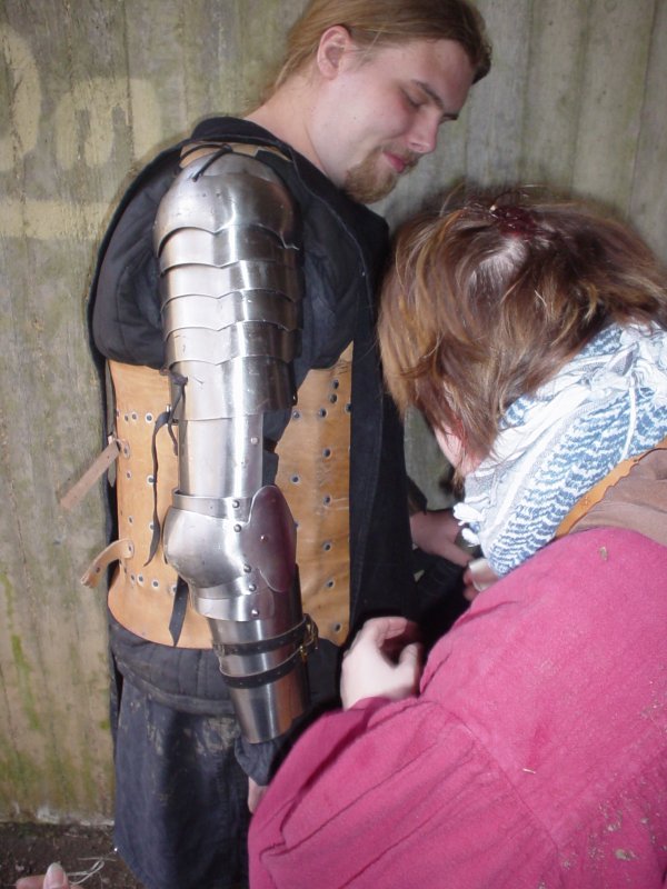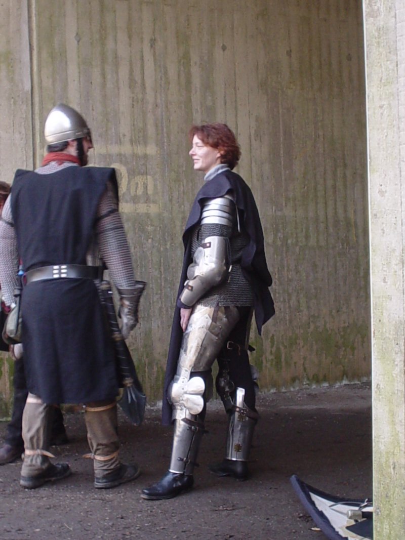 ... and getting ready to leave. Caitlins legs were made by Gundo, as were the arms. Shoulders by Caleb, greaves from Russian armoury. Butted haubergeon by local maker. She is working to replace the maille with a breast and backplate.